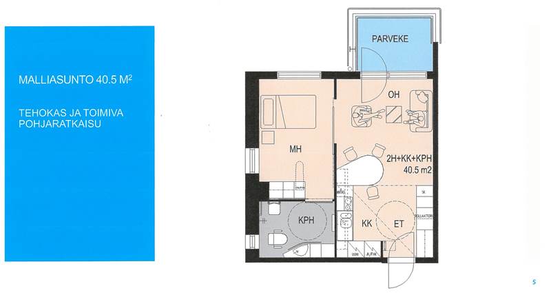 Malliasunto suunniteltiin kaksiona, jossa makuuhuoneesta on suora yhteys WC-tilaan (vaarallinen yöliikkuminen helpottuu ja tapaturmariski pienenee). Yhteensovitettu ruokapöytä ja näkökorkeudelle sijoitettu uuni (kantamisriski). Kumartumisriski helpottuu oikeilla mitoituksilla kalusteissa. Kurottamisen tukena ovat tasoittain sijoitetut tukikaiteet jne. Esteettömyys ja toimintakykyä tukeva ympäristö mahdollistavat turvallisen omatoimisuuden asumisessa.