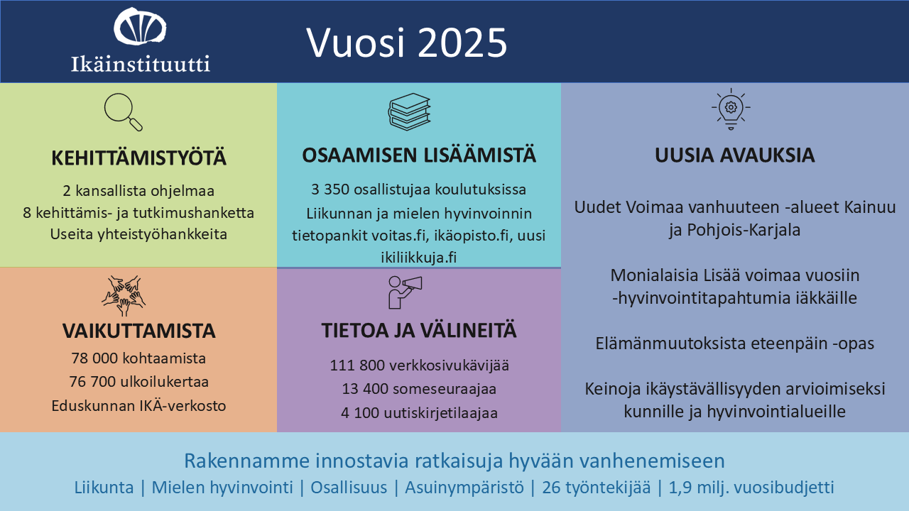 Ikäinstituutin toiminnan lähtökohtana on ikäihmisen oma ääni, kokemus arjesta ja ympäröivästä yhteiskunnasta.