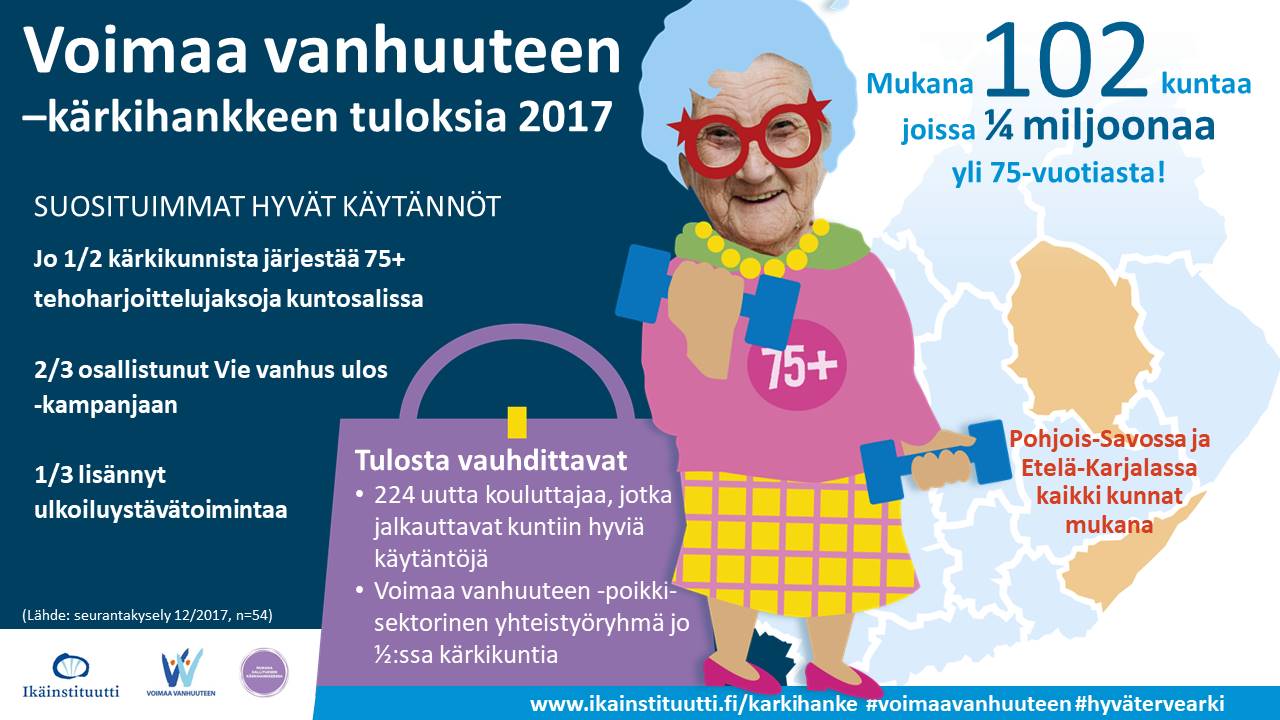 Voimaa vanhuuteen tutuksi ja tavaksi -kärkikunnaksi on rekisteröitynyt johtavan viranhaltijan päätöksellä jo 102 kuntaa. Viime vuonna koulutettiin 200 liikunnan, kuntoutuksen ja seniorityön ammattilaista sekä järjestöjen vapaaehtoistoimijoita jalkauttamaan kuntiin ikäihmisten terveysliikunnan hyviä käytäntöjä. Tavoitteena on tukea itsenäistä kotona asumista ja osallisuutta lisäämällä nimenomaan vähän liikkuvien, heikentymisriskissä olevien iäkkäiden voima- ja tasapainoharjoittelua sekä ulkoilua. Kunnat lisäävät liikuntaa yhdistämällä ennakkoluulottomasti kaikkien sektoreiden, myös järjestöjen voimavarat. Vuonna 2018 Voimaa vanhuuteen -työtä vauhditetaan ja syvennetään maakunnallisilla oppimisverkostoilla.