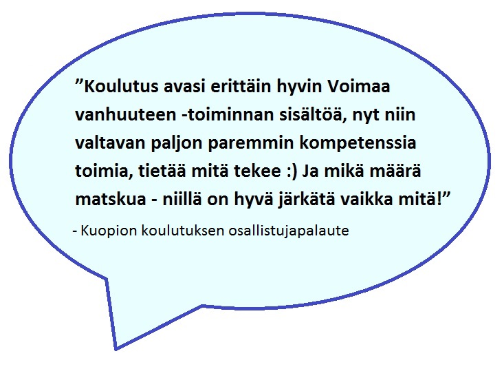 Tämän vuoden Hyvät käytännöt koulutukset on pidetty. Koulutus koettiin hyödylliseksi Voimaa vanhuuteen -työn käynnistämisessä. Koonti Hyvät käytännöt -koulutuksista löytyy täältä.