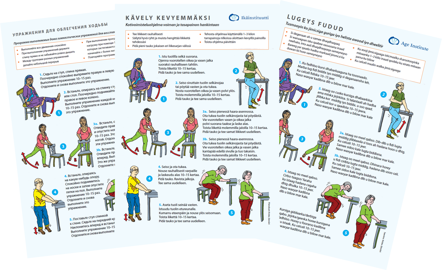 Suosittu Kävely kevyemmäksi -kotivoimisteluohjelma (A4) on saanut uudet piirroskuvat. Voiman ja tasapainon hankintaan tarkoitettu kuuden liikkeen jumppaohjelma on nyt saatavilla seitsemällä eri kielellä: