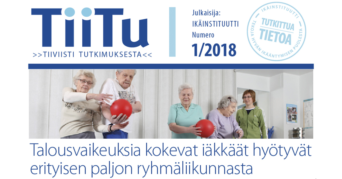 Ikäinstituutin ensimmäinen TiiTu, tiiviisti tutkimuksesta -uutiskirje ilmestyi kesäkuussa, teemana Voimaa vanhuuteen -liikuntaryhmiin osallistuneiden ikäihmisten koetut hyvinvointivaikutukset. Uutiskirjeessä oli myös linkityksiä  ikäihmisten  terveysliikunnan hyviin käytäntöihin. Tiitu sopii hyvin ikäihmisten terveysliikunnan kehittämistyöhön ja päättäjäviestintään.