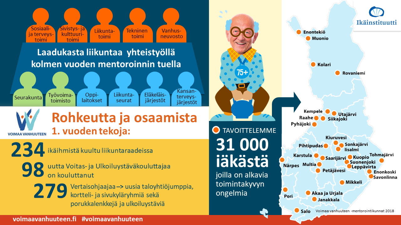 Tähän mennessä 27 kuntaan on koulutettu 98 voima- ja tasapainoharjoittelun (VoiTas) ja ulkoilun kouluttajaa. Kouluttajat ovat puolestaan valmentaneet kuntiinsa 279 vertaisohjaajaa, jotka vetävät innolla uusia taloyhtiöjumppia, kortteli- ja sivukyläryhmiä, penkkilenkkejä ja kulttuurikävelyjä.