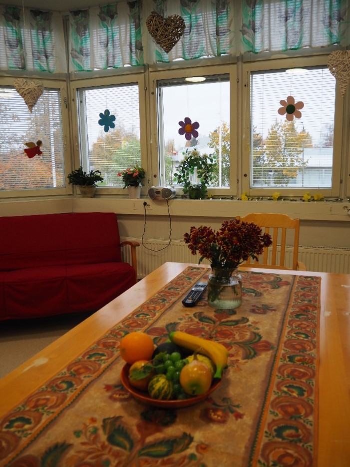 Yksikön ympärillä on runsaasti erilaisia piha-alueita. Näistä kaksi on rajattuja ja soveltuvia asukkaiden turvalliseen ulkoiluun. Sisätilat ovat valoisat ja ikkunoita on paljon, mikä tuo tiloihin luonnonvaloa ja näkymiä ulos. Rakennuksen sokkelomainen rakenne ja kodinomainen sisustus vähentävät laitosmaisuuden tuntua. Henkilökunnalla on osaamista ja motivaatiota kehittää tilojen viihtyisyyttä entisestään.