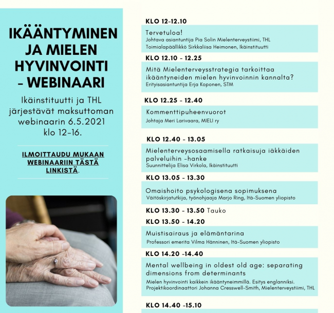 Ikäinstituutin ja THL:n viidenteen yhteisseminaariin osallistui tänä vuonna yli 300 ihmistä. Tänä vuonna seminaari järjestettiin webinaarina, joka osaltaan mahdollisti suuren osanoton.