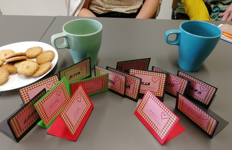 Vaikka tapaamisen virallinen alkamisaika on kello 10, ovi alkaa käydä tiuhaan jo puoli kymmeneltä ja eteisen naulakko täyttyy ulkovaatteista ja kengistä. Täällä saa nimittäin olla sukkasillaan ja eteisen korista voi valita varpaiden lämmikkeeksi itselleen mieleisen väriset villasukat. Nimi Porinaporukka kuvaa osuvasti tätä porukkaa! Iloinen porina täyttää koko tilan samalla, kun osallistujat kokoontuvat pikkuhiljaa pitkän pöydän ääreen nauttimaan aamupäiväkahvit ja vaihtamaan kuulumisia. Tällä kertaa paikalla on vain naisia: 13 ikäihmistä, joista suurin osa on täyttänyt 80 vuotta ja vanhin on jo 93-vuotias. Kahvittelun lomassa puheenaiheina vilisevät muun muassa säätila, nukahtamisongelmat ja erilaiset pienet kolotukset, mutta vähitellen keskustelu muuttuu koko porukan yhteiseksi ja yhteistuumin päätetään, että tehdään päivästä hyvä.