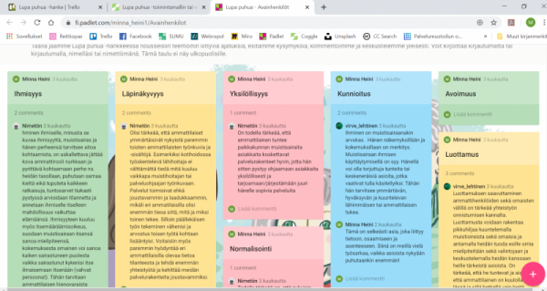 Työyhteisössämme päätettiin heti siirtyä etätyöskentelyyn. Muutos ei ollut meille suuri, olimmehan jo aiemmin tehneet paljon etätyötä. Sen sijaan hanketyömme, joka perustuu kohderyhmiemme yhteen tuomiseen ja vuoropuhelun käynnistämiseen, jouduttiin miettimään uudelleen. Tarvittiin uusia ideoita myös hankkeen etenemisen suunnitteluun.