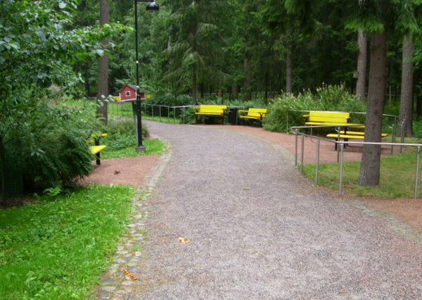 - Tasaisella kävelyreitillä huonomuistisen matkaa helpottaa polun sisäreunaa kiertävä kaide, joka johdattaa kulkijan turvallisesti takaisin lähtöpaikalle.