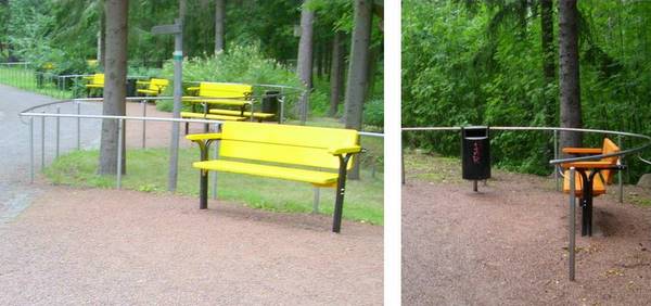 - Levähdyspaikkojen suunnittelu ja toteutus, huomiota herättävä väritys ja sijoittelu maastoon ovat huonomuistisille, näkövammaisille ja liikuntarajoitteisille apuna ympäristössä suunnistaessa.