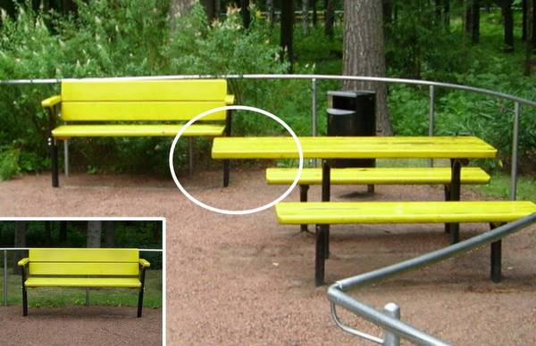 - Pyörätuolilla liikkuvat on huomioitu varaamalla riittävästi tilaa penkkien viereen. Lisäksi pidennetyt pöytälevyt mahdollistavat pyörätuolilla pääsyn levähdyspaikoilla pöydän ääreen.