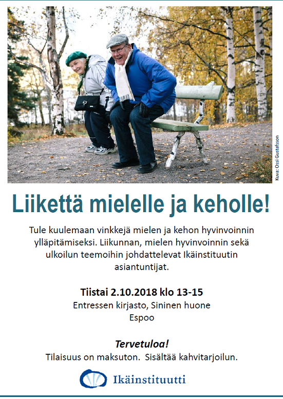 Liikettä mielelle ja keholle! Tiistaina 2.10.2018 klo 13-15 24.09.2018 09:11 Liikettä mielelle ja keholle 2.10.2018_Espoo (PDF) Kauppakeskus Entressen kirjasto, 3. kerros, Siltakatu 11, Espoo Hyvä vanhuus Muut Uutiset
