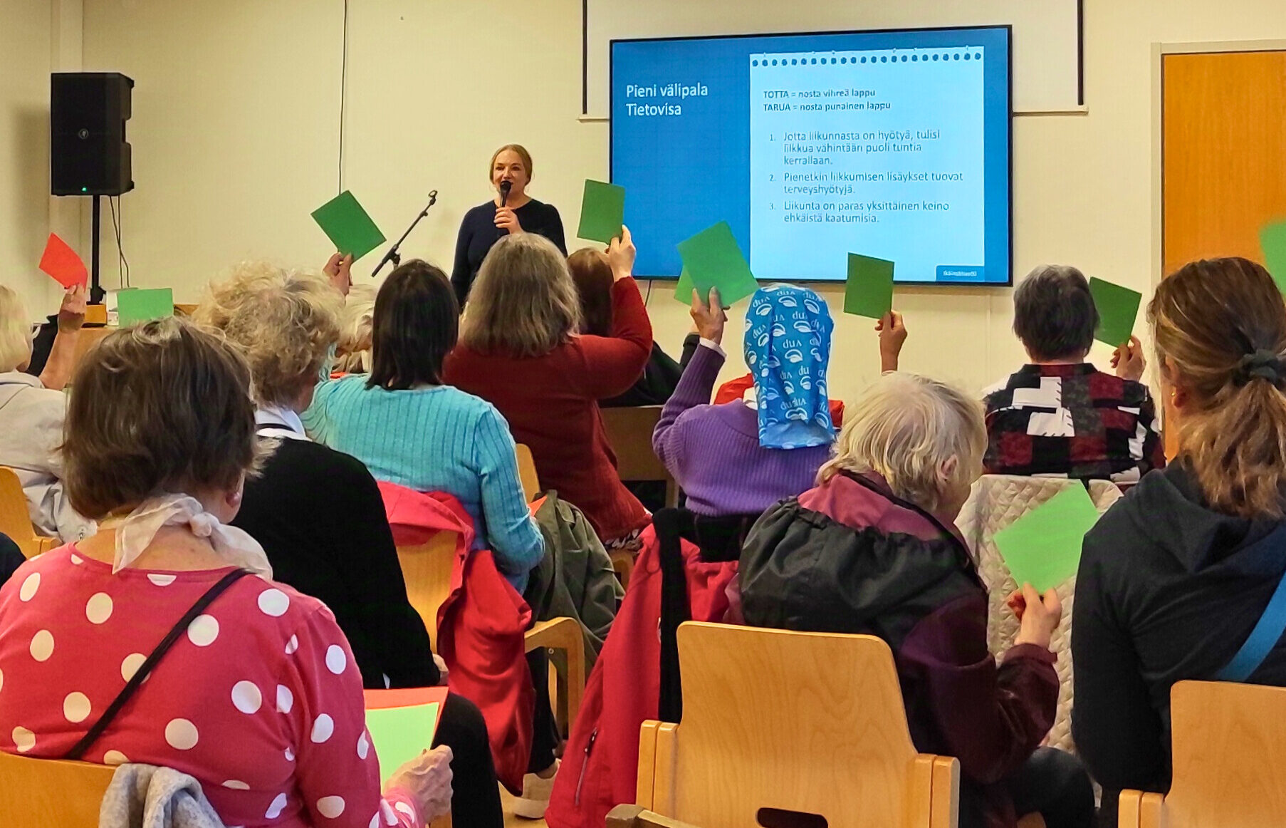 Iso kuva: Vuorensyrjän palvelutalossa Elina Vuorjoki-Andersson esittämässä yleisölle kysymystä, johon he vastaavat vihrein ja punaisin lapuin.