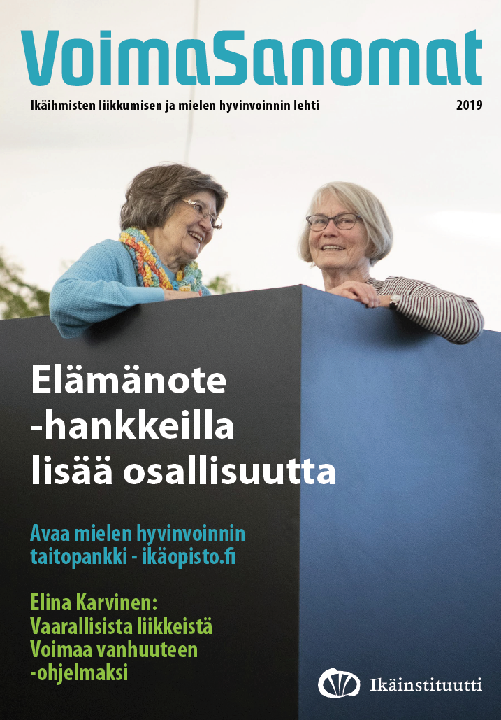 Ikäinstituutin vuoden 2019 liikkumisen ja mielen hyvinvoinnin Voimasanomat-lehti on nyt luettavissa ISSUU-palvelussa. Tämän vuoden teemana on osallisuus. Tutustu Elämänote-hankkeisiin, mielen hyvinvoinnin peruspilareihin, muisti- ja ikäystävälliseen asuinympäristöön tai hyvän arjen voimavinkkeihin.