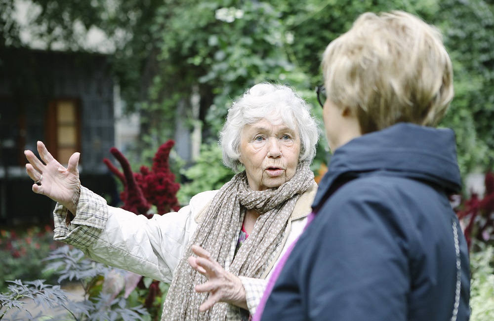 Yhtenä päivänä Ainon ovikello soi ja häntä pyydettiin mukaan pihakävelylle. Kävelyn aikana sai kertoa mitä pihalla teki ja esittää toiveita. Ainokin uskalsi kertoa, että kävisi mielellään ulkona useammin, jos ovi erottuisi paremmin ja olisi penkki, jossa huilata. Oven molemmille puolille laitettiinkin samanlaiset värikkäät ruukkuistutukset, joihin vaihdetaan kasveja vuodenajan mukaan. Oven lähelle hankittiin penkki ja puiden katveeseen istuskeluryhmä, jonne pääsee helposti rollaattorinkin kanssa. Aino käy siellä muutaman kerran viikossa. Naapuritkaan eivät ole enää niin vihaisia hänelle. Yksi heistä jopa tuo vastaleivottua pullaa aina silloin tällöin. Kun vielä kynnysmatto vaihdettiin vaaleammaksi ja pihan valaistusta parannettiin, Ainon liikkuminen ja ulkoilu lisääntyikin huomattavasti.